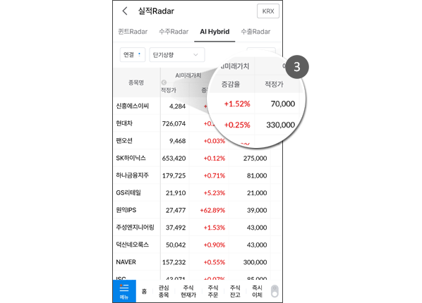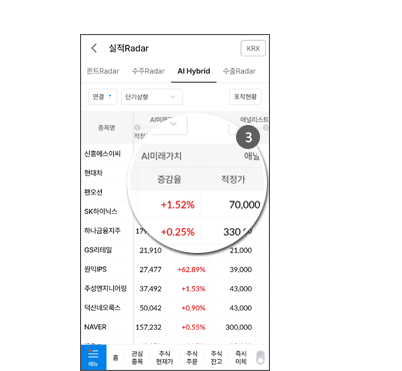 종목을 제공하는 서비스입니다. - Point 2 AI-Hybrid Radar>상승유망종목에서는 현재가격과