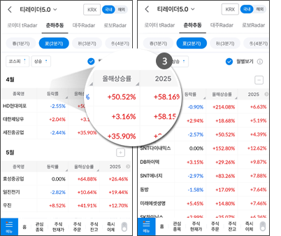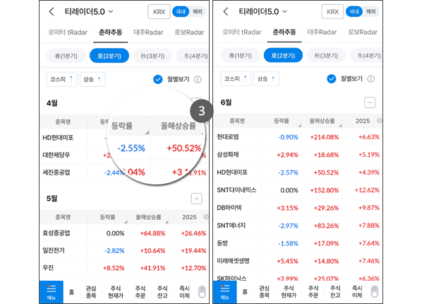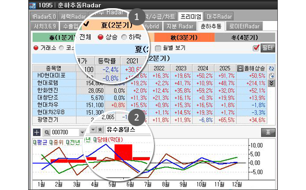 • 화면의 최상단에는 최근 5년간 해당 분기/월에 상승/하락추이를 보였던 종목이 제공됩니다.