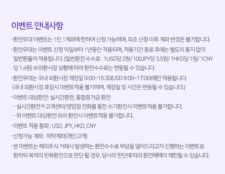 - 본 이벤트는 해외주식 거래시 발생하는 환전수수료 부담을 덜어드리고자 진행하는 이벤트로 환차익 목적의 반복환전으로 판단 될 경우, 당사의 판단에 따라 환전혜택이 제한될 수 있습니다.