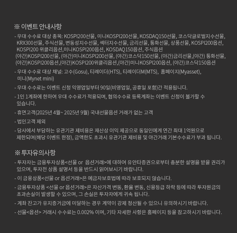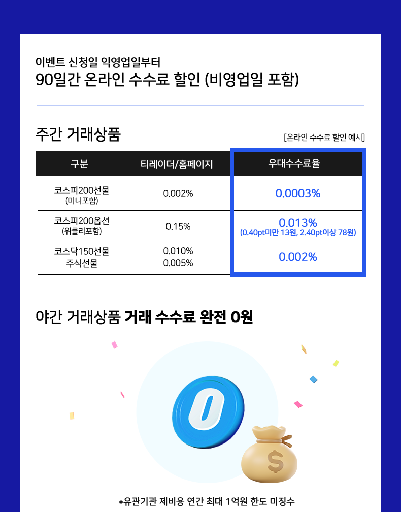 • 우대 수수료 대상 종목: KOSPI200선물, 미니KOSPI200선물, KOSDAQ150선물, 코스닥글로벌지수선물, KRX300선물, 주식선물, 변동성지수선물, 섹터지수선물, 금리선물, 통화선물, 상품선물, KOSPI200옵션, KOSPI200 위클리옵션,미니KOSPI200옵션, KOSDAQ150옵션, 주식옵션 (야간)KOSPI200선물, (야간)미니KOSPI200선물, (야간)코스닥150선물, (야간)금리선물,(야간) 통화선물, (야간)KOSPI200옵션,(야간)KOSPI200위클리옵션,(야간)미니KOSPI200옵션, (야간)코스닥150옵션