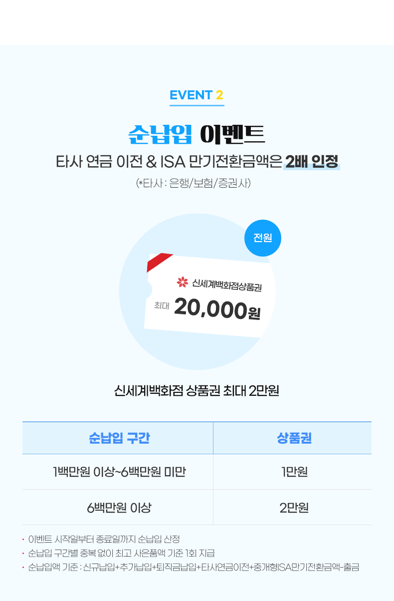 - 연금 이전 건이 다수일 경우 이벤트 기간 동안 고객별 이전금액을 합산합니다.