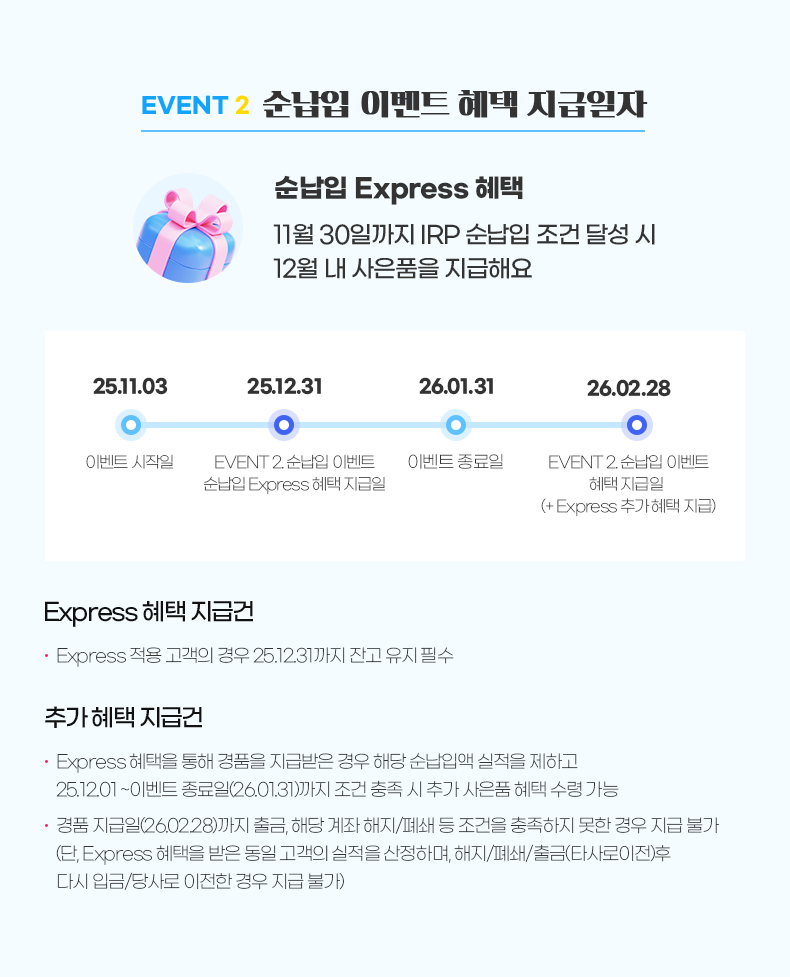 - Express 혜택을 통해 경품을 지급받은 경우 해당 순납입액 실적을 제하고 25.12.01 ~이벤트 종료일(26.01.31)까지 조건 충족 시 추가 사은품 혜택 수령 가능