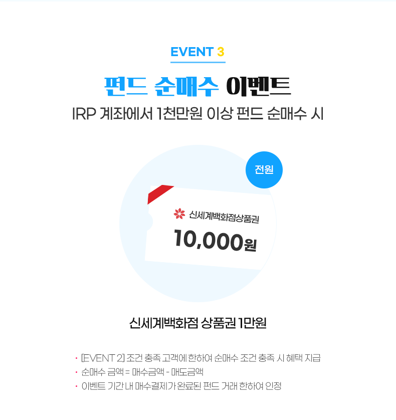 - EVENT 1. [신규가입 이벤트] & EVENT 2. [순납입 이벤트] & EVENT 3. [펀드 순매수 이벤트] 사은품은 조건 충족 시 중복 지급되나, 퇴직연금 특별이익 제공한도 연간 누적 3만원 (퇴직연금감독규정 제 16조 2항)에 따라 퇴직연금관련 이벤트 등으로 2025년, 2026년 각각 당사에서 수령 가능한 최대 경품은 3만원입니다. 초과 시 경품 제공이 제한됩니다.