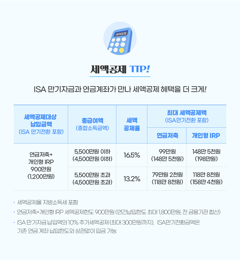 - ISA 만기자금 납입액의 10% 추가세액공제 (최대 300만원까지), ISA만기전환금액은 기존 연금 계좌 납입한도와 상관없이 입금 가능