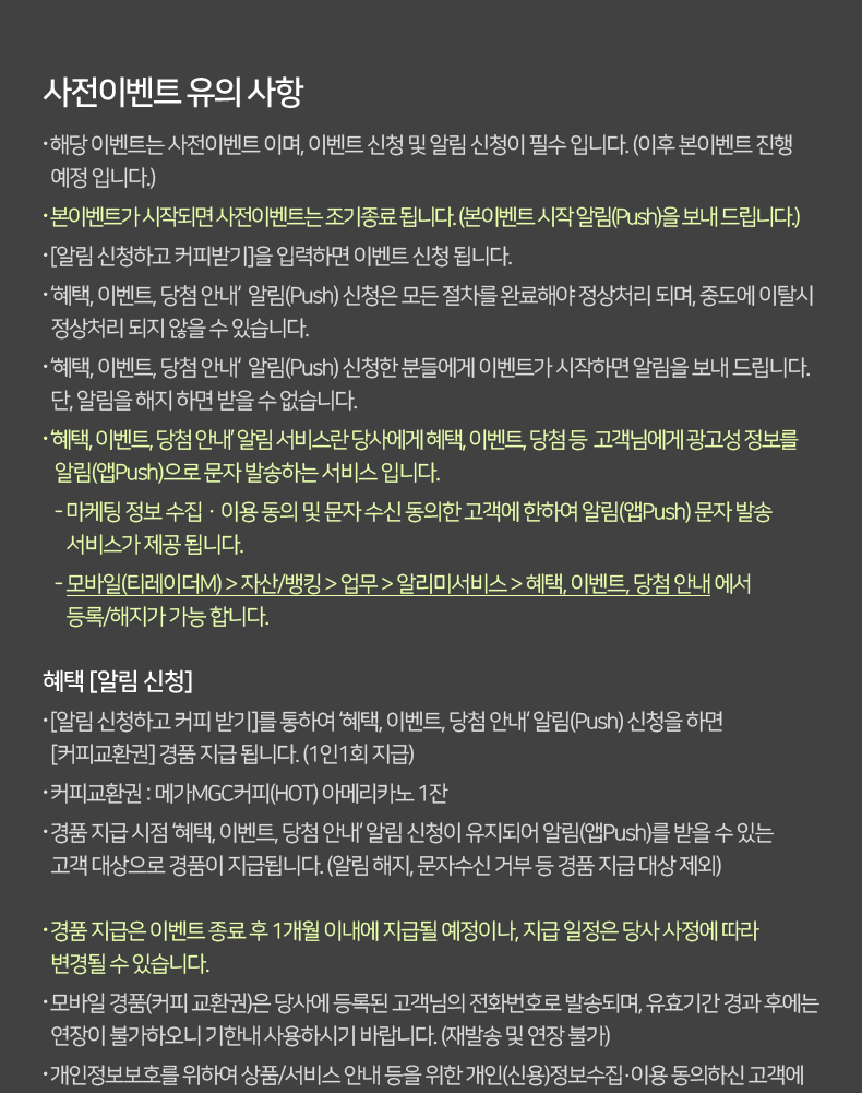 • [알림 신청하고 커피 받기]를 통하여 ‘혜택, 이벤트, 당첨 안내‘ 알림(Push) 신청을 하면 [커피교환권] 경품 지급 됩니다. (1인1회 지급)