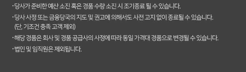 • 당사 사정 또는 금융당국의 지도 및 권고에 의해서도 사전 고지 없이 종료될 수 있습니다. (단, 기조건 충족 고객 제외)