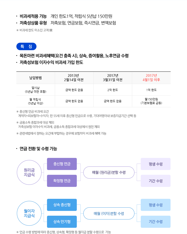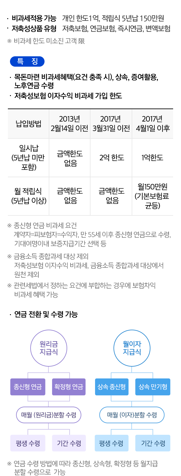 납입방법 2013년 2월 14일 이전 2017년 3월 31일 이전 2017년 4월 1일 이후 일시납(5년납 미만 포함) 금액 한도 없음 2억 한도 1억 한도 월 적립식(5년납 이상) 금액 한도 없음 금액 한도 없음 월150만원(기본보험표 균등) - ※ 종신형 연금 비과세 요건: 계약자=피보험자=수익자, 만 55세 이후 종신형 연금으로 수령, 기대여명이내 보증지급기간 선택 등