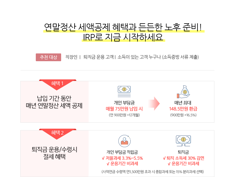 - 2 개인형 IRP를 함께 가입하시면 세액공제 납입 한도가 900만원까지