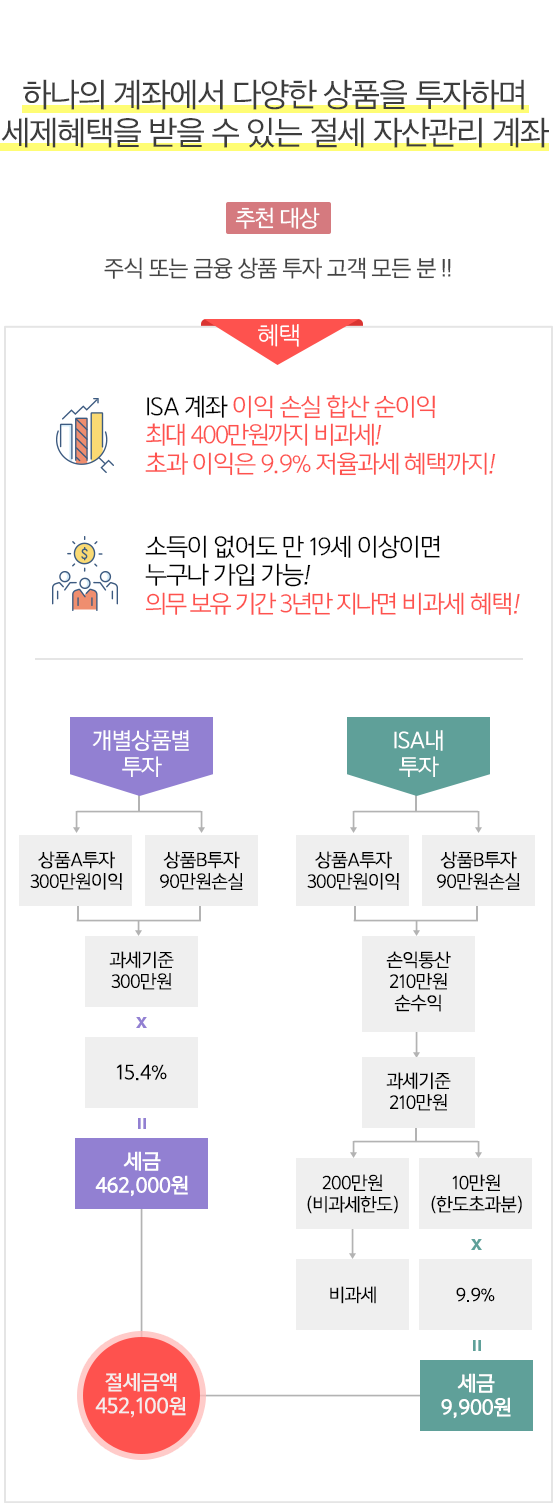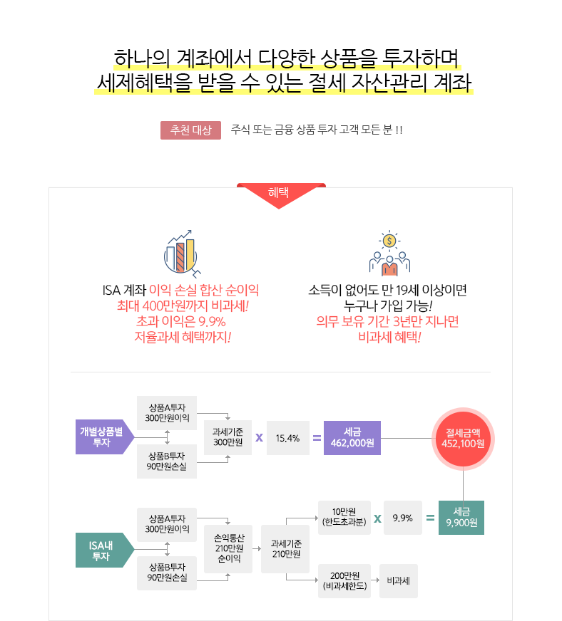 - 개별 상품별 투자로 상품A투자 300만원 이익, 상품B투자 90만원 손실이 있으면 과세기준 300만원×15.4%= 세금462,000원인데 ISA내 투자로 상품A투자 300만원 이익, 상품B투자 90만원 손실이 있으면 손익 통상 210만원 순이익에서 과세기준 210만원으로 10만원(한도초과분)×9.9%=세금 9,900원, 200만원(비과세한도)은 비과세로 ISA내 투자가 개별상품별 투자보다 452,100원의 절세효과가 있습니다.