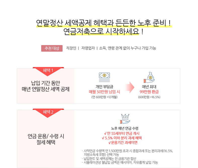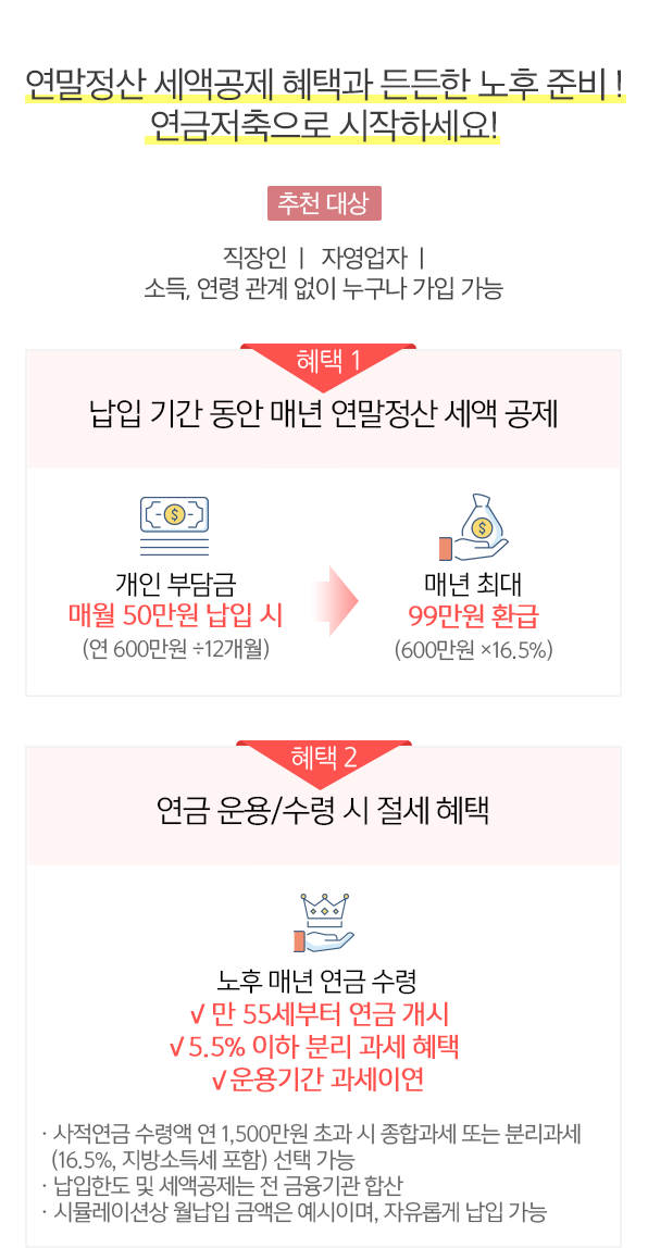 - 노후 매년 연금 수령: 만 55세부터 연금 개시, 5.5% 이하 분리 과세 혜택, 운용기간 과세이연