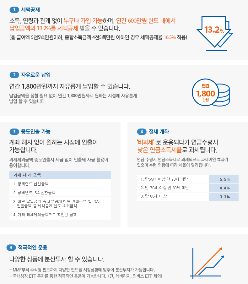 소득, 연령과 관계 없이 누구나 가입 가능하며, 연간 600만원 한도 내에서 납입금액의 13.2%를 세액공제 받을 수 있습니다.