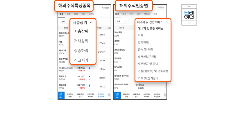 티레이더M → 해외주식 시세 → 해외주식업종별